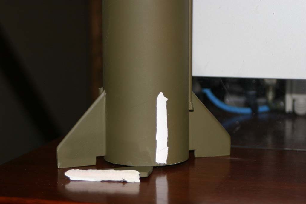 I launched the Pershing II on a D12-3 for the first time. It was a bitter sweet launch. Perfect launch and it went up straight as an arrow. Chute deployed fine, but the wind picked up about then and carried it over to the ball field. It slammed pretty hard into the chain link back stop wedging the nose cone in it. Knocked a fin off which is an easily fix, but it shattered the styrene wrap on the nose. Anyway, it proved out to be a great flyer. And from there is sat damaged for 10 years on a shelf.