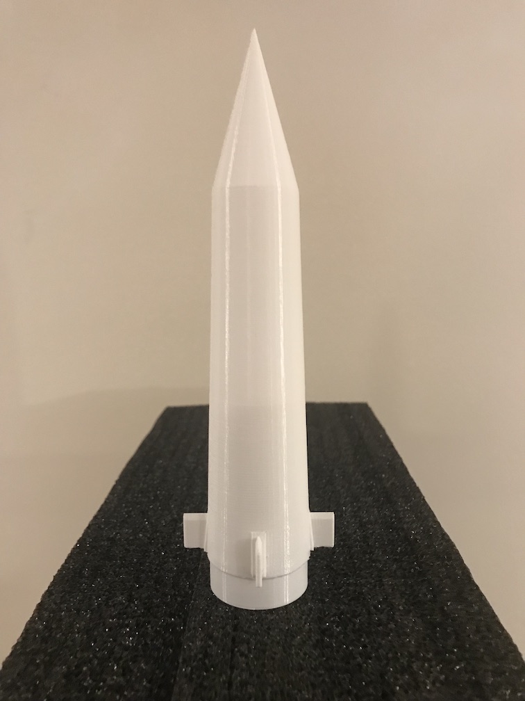 While I was searching for the Mercury Redstone scale date, I was reminded of the US Army Redstone Missile. I used the scale data I came across and created a 3D model of a nose cone in the same 1:52 scale for an ST-16/BT-56 tube size. I printed a test cone overnight, it turned out pretty good, although I have some layering issues in my model I need to address, there are some print imperfections on the back side, so not there yet. Not counting the shoulder, the cone is about 6.4 inches tall and weighs 15 grams.
